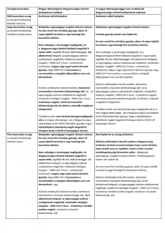 A külföldi az országokat három - piros, sárga, zöld  - kategóriába sorolták. A  sárgával és pirossal jelölt országokból való beutazás esetén, a határon belépőket szúrópróbaszerűen ( közúton és repülőtéren is) egészségügyileg szűrik, testhőmérséklet-mérést végeznek náluk és kérdőívet kell kitölteniük, valamint hatósági házi karantént rendelnek el náluk a korábban megszokott módon.  A határellenőrzéssel kapcsolatos feladatokat a rendőrség végzi.  A hatósági házi karanténra kijelölt személy köteles otthonában maradni 14 napig és tünetek esetén háziorvosát értesíteni. Amennyiben valaki mentesülni szeretne a hatósági házi karantén alól, akkor PCR-tesztet végeztethet el, sárga jelölésű ország esetén már 1 db negatív, piros jelölésű ország esetén 2 db negatív PCR-teszt esetén oldható fel a karantén.